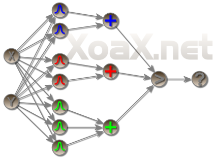 The diagram above depicts the classification algorithm for a classifying two-dimensional data with three classes or categories. The categories have 2, 2, and 3 pattern units each. However, we can have any number of pattern units. We add new pattern units and even new categories at any time without needing to retrain the network. This is a one of the advantages of Probabilistic Neural Networks. The downside is that as the network gets more complex, the speed and accuracy decrease. As a practical matter, we might also want to adjust sigma to make our patterns narrower as the number of patterns grows.