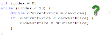 Suppose, for example, that we have retrieved the price of a music CD from several websites. We would like to find the best price for the CD. Look at the code below. If we have an array of 10 prices and we would like to select the lowest price, which operator should we use inside the square brackets to properly access the array?