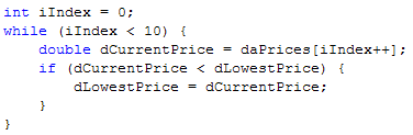 As an additional programming note, we would need to initialize the lowest price to something larger than the lowest music CD price. Hopefully, something like 100 dollars would do it, but relying on arbitrary values like this is bad practice. If inflation suddenly hit, our value might not be sufficiently high to be assured that the value is higher than the price of current music CDs. In this case, our code would fail. A better way to handle this is to initialize the lowest price to something like the first price in the array.
