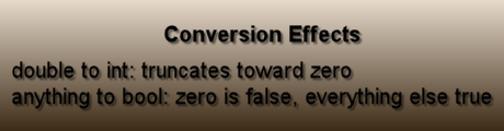 When converting from one type to another, some unexpected results can occur. Conversions from a double to an integer type and conversion to a bool are probably the least intuitive. The remaining conversions should be relatively obvious as long the conversion remains in the range of the target type. Otherwise, you may lose precision (converting a double to a float) or end up with a strange result.