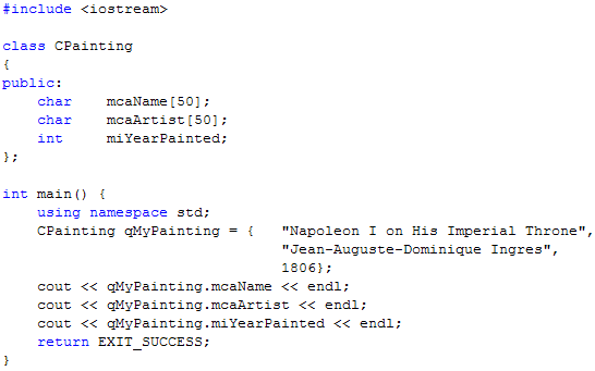 This code sample shows the class definition before the main() function. In the main function, we declare and initialize an instance of the painting class. Then we use the dot operator to access data member in our painting object and send them to the console window.