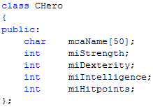 We can define classes to represent anything. Below, we show how we might define a class to represent a hero character in a Role-Playing Game (RPG). We have a name and a few attributes like strength, dexterity, and intelligence, which typically correspond to fighters, thieves, and mage character classes respectively. Of course, we have to include hit points too in order to let us know when the character dies in battle.