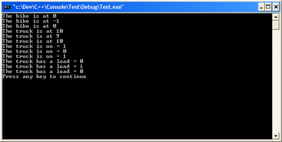 The class CBicycle inherits functionality from CVehicle, which simply allows for movement along a line. The class CMotorizedVehicle adds functions to turn itself off and on. The class CTruck adds functionality to load and unload itself. So, objects of type CTruck have all of the functionality of CVehicle, CMotorizedVehicle, and CVehicle. In our main function, we demonstrate the functionality of the objects of type CBicylcle and CTruck. Below is the output of the program.
