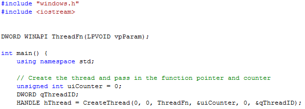 The function that we use to make new threads is the function CreateThread(), which returns a handle to the newly created thread. This function takes several parameters. The parameters that we are most interested in are the thread function and the parameter that is passed into the thread function when it is called. The thread function has a void pointer as its sole argument, and this argument come via the fourth parameter of our CreateThread() function. In the case of this thread, its function is ThreadFn() and the parameter that is passed into it is a pointer to the unsigned int "uiCounter." Although we pass in a Thread ID parameter and get a value back, we will ignore it for the present lesson.