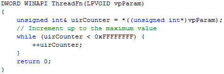 The second thread begins its execution in the function ThreadFn(). Most of the time, this threads remains in the internal loop that increments the counter variable. Internally, we refer to the counter "uiCounter" by the reference "uirCounter." Eventually, the counter reaches its maximum value and the thread exits the function.