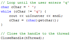 At the same time the second thread is executing this loop, main thread is in a loop that outputs the value of the counter every time the "Enter" key is pressed. The longer the user waits between subsequent presses, the more the value of the counter increases. This is because the second thread is incrementing the counter at the same time the main thread is running this loop. The main thread leaves this loop when we enter 'q.' Then the main thread closes the handle to the threadwe will explain why this is done later.
