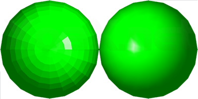 Smooth shading is accomplished via linear interpolation and the method is known as Gouraud shading. The shading model is set via a call to the function glShadeModel() with the appropriate argument. If no shade model is set, smooth shading is used by default. In this lesson, we drew tha same objects with both flat and smooth shading. Below, we have the two spheres that we rendered. Notice that the smoothly shaded sphere looks more spherical than the flatly-shaded one.