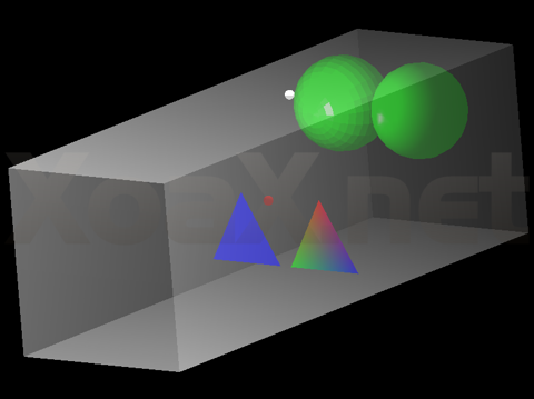 From the outside, we can look at the scene as we have rendered it. The spheres are centered on the plane z = 2 and the triangles are in the plane z = .2. The small red sphere shows that placement of the viewer at the origin. The small white sphere shows the position of the light source at (0.0, 1.0, .5). The bounding box is in gray and runs from 1 to 1 in the x and y directions and 3 to 3 in the z-direction. The viewer looks toward the negative z-axis.