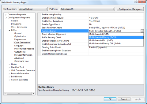 Now you should see a drop-down arrow next to "Multi-threaded Debug DLL." Left-click the arrow to expand the list, and left-click "Multi-threaded Debug" in the list. Finally, commit the changes by left-clicking the "Apply" button and then the "OK" button.