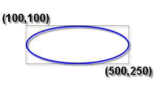 In the second section, we draw an ellipse by making a call to the Arc() function. The parameters 100, 100, 500, 250 specify the upper-left hand corner of the bounding rectangle with the first two coordinates (100, 100) and the lower-right hand corner with the last two coordinates (500, 250). The remaining zeros that are passed in are not important for drawing an ellipse, but will be used when we draw arcs.