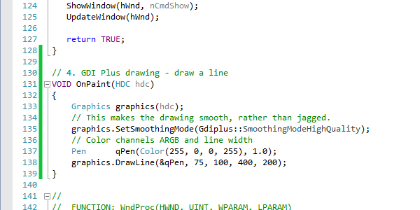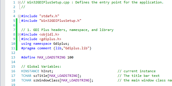 Near the top of the file, we added the lines 7-11 after the header file includes. The lines 7-8 are two more headers that we are including. Line 9 is using directive to tell the compiler to add the namespace and scope resolution operator to type names for the GDI plus types. For example, we use the types Gdiplus::Color and Gdiplus::Pen. The using directive allows us to the use them without the scope resolution operaton and namepsace name. Finally, line 11 links the library "Gdiplus.lib" after compilation.