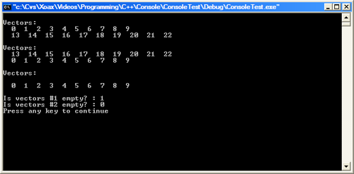 // An example using the swap(), clear(), and empty() functions #include <iostream> #include <vector> void PrintVector(const std::vector<int>& kqrVector) { std::vector<int>::const_iterator qIter; for (qIter = kqrVector.begin(); qIter != kqrVector.end(); ++qIter) { std::cout << " " << (*qIter); } std::cout << std::endl; } int main() { using namespace std; // Fill two vectors with the numbers 0 through 9 // and 13 through 22 vector<int> qVector1; vector<int> qVector2; for (int iIndex = 0; iIndex < 10; ++iIndex) { qVector1.push_back(iIndex); qVector2.push_back(iIndex + 13); } cout << endl << "Vectors:" << endl; PrintVector(qVector1); PrintVector(qVector2); // Swap the entries in both vectors swap(qVector1, qVector2); cout << endl << "Vectors:" << endl; PrintVector(qVector1); PrintVector(qVector2); // Clear vector 1 qVector1.clear(); cout << endl << "Vectors:" << endl; PrintVector(qVector1); PrintVector(qVector2); // Report whether the vectors are empty using empty() cout << endl; cout << "Is vectors #1 empty? : " << qVector1.empty() << endl; cout << "Is vectors #2 empty? : " << qVector2.empty() << endl; return 0; }