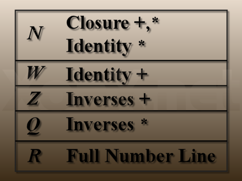 These properties are closure, identity, and inverses under addition and multiplication. The Natural Numbers, N, are closed under addition and multiplication and contain the multiplicative identity element 1. The Whole Numbers, W, add an additive identity element to that. Additive inverses are included with the set of Integers, Z. The Rational Numbers, Q, add multiplicative inverses for all nonzero elements. Finally, the Real Numbers, R, add the remaining elements to the number line.